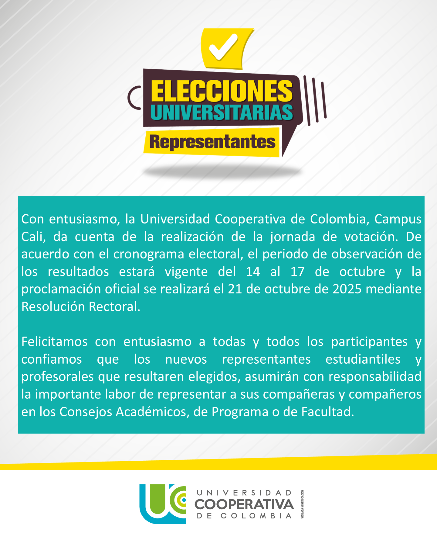 Con entusiasmo, la Universidad Cooperativa de Colombia, Campus Cali, da cuenta de la realización de la jornada de votación. De acuerdo con el cronograma electoral, el periodo de observación de los resultados estará vigente del 14 al 17 de octubre y la proclamación oficial se realizará el 21 de octubre de 2025 mediante Resolución Rectoral.