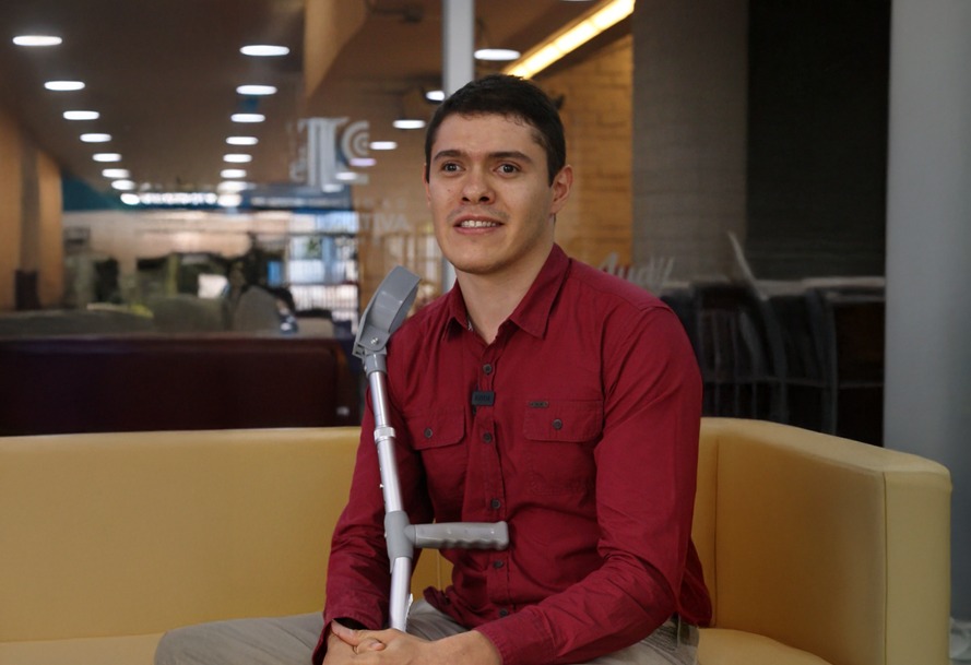 Daniel tiene 27 años y desde los cinco años ha vivido un proceso de recuperación física y cognitiva, luego de haber sufrido una encefalitis bacteriana producto de una reacción adversa a una vacuna. Esta situación lo llevó a cuidados intensivos durante 22 días, y desde entonces ha trabajado constantemente en su rehabilitación. Hoy camina alegre y motivado por los pasillos, aulas y laboratorios de la institución, con sus muletas para apoyar su movilidad.