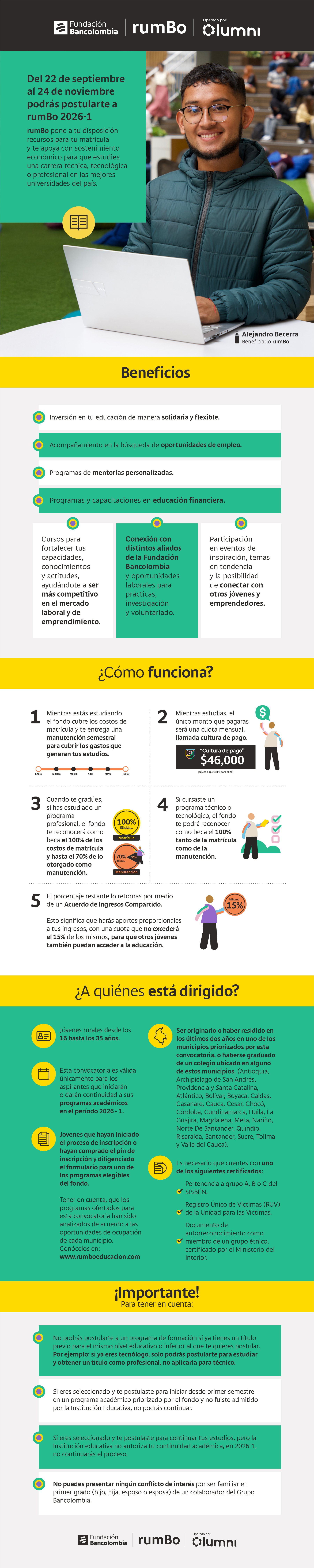 El fondo rumBo, de la Fundación Grupo Bancolombia y operado por Lumni, invierte en jóvenes rurales para que puedan acceder y terminar sus estudios de educación posmedia, o de formación para el trabajo y desarrollo humano.