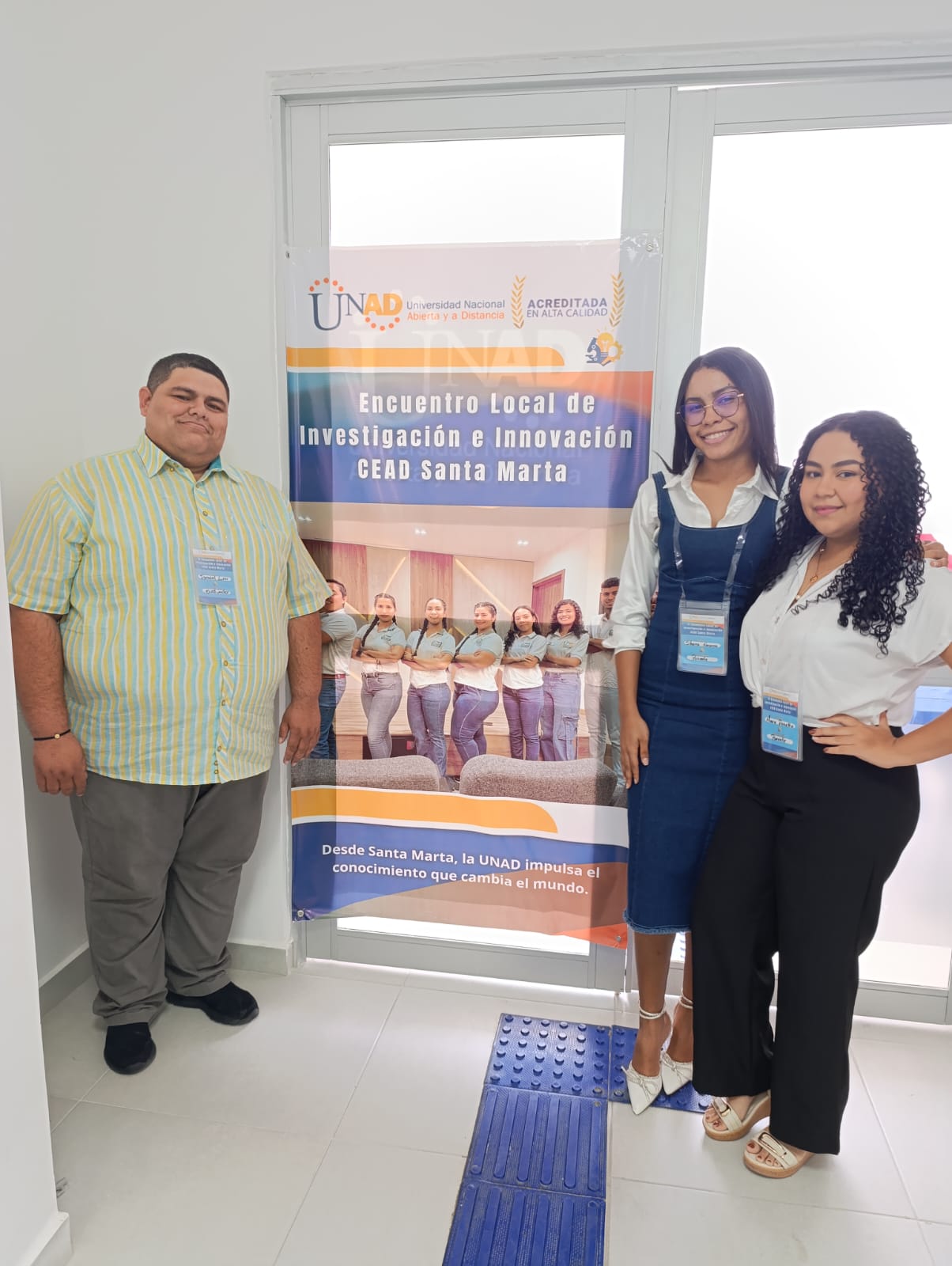 Las estudiantes María Panetta de Ávila y Shaira Navarro Arrieta junto al profesor Ismael Luna Morán del programa de Contaduría Pública de la Universidad Cooperativa de Colombia, Campus Santa Marta, se destacaron en el IV Encuentro de Investigación e Innovación de la UNAD CEAD Santa Marta 2025, un espacio interinstitucional dedicado a la divulgación científica y al fortalecimiento de la cultura investigativa en la región.